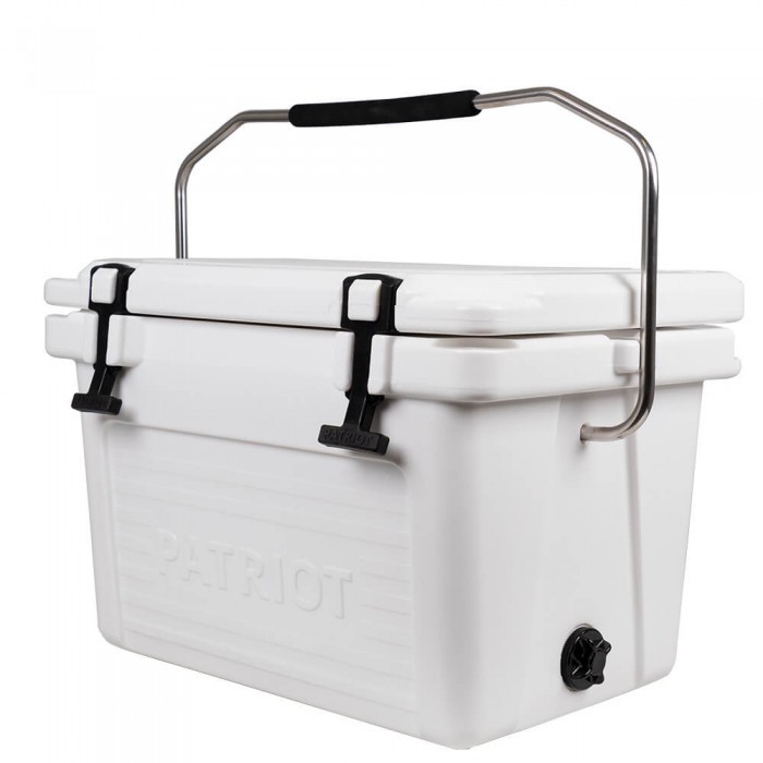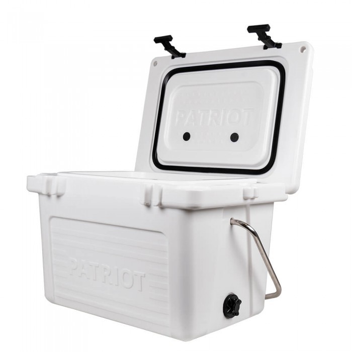 The 20qt Patriot Cooler is built for all of your adventures! Whether you're heading out for a day trip to the beach, fishing on the lake, or watching the kids play their favorite sport, the Patriot Cooler keeps food and drinks colder with its extra thick insulated walls. Includes an embossed measuring ruler on the lid for the fishing enthusiasts. Easily carry the cooler with the molded side handles or use the convenient heavy-duty stainless-steel locking handle. Made in the USA.