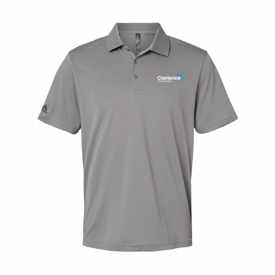 This Adidas performance polo features 3.8 oz 100% recycled polyester with a hydrophilic finish, UPF 50+ protection. Ribbed knit collar with three button placket and open sleeve. Contrast color heat transfer logo on the right sleeve.